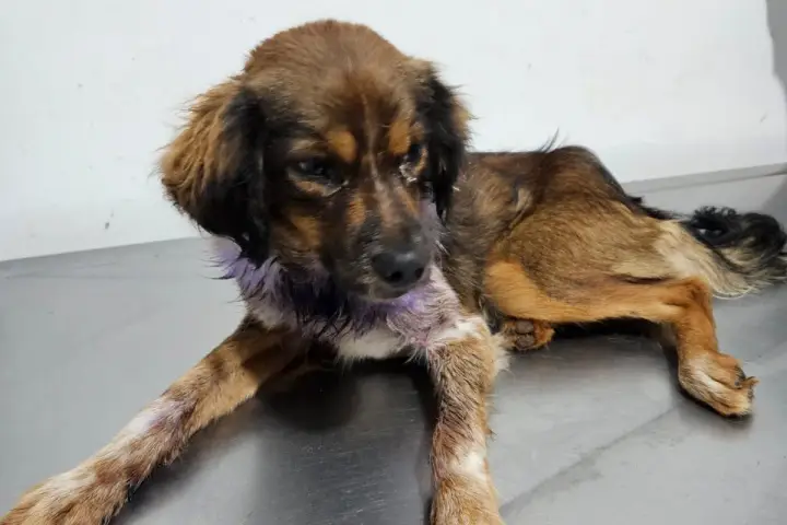 O cachorro foi encontrado em condições de extrema fragilidade: ele possuía um ferimento no pescoço, estava muito magro e tinha dificuldades para andar.