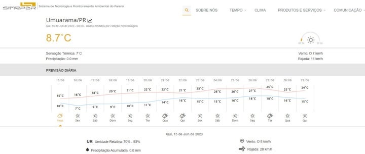 O frio segue intenso nesta quinta-feira (15) em Umuarama, que registrou a sensação térmica de 7ºC por volta das 8h da manhã. De acordo com o Simepar (Sistema de Tecnologia e Monitoramento Ambiental do Paraná), é esperado que a máxima do dia alcance 15°C – o que deve acontecer entre as 14h e 17h.