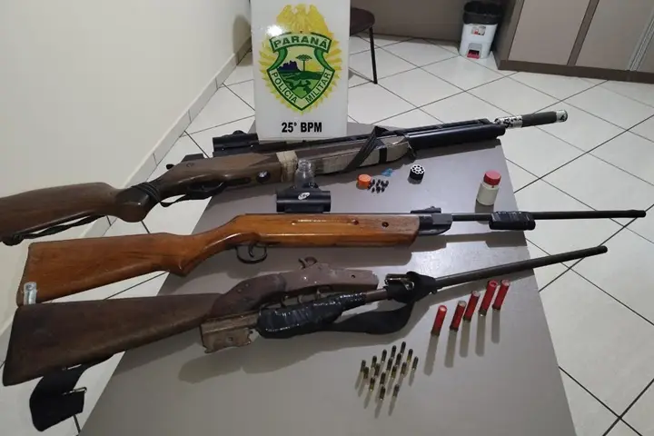 Dois homens, de 47 e 33 anos, foram presos após serem flagrados em posse de espingardas e munições durante uma abordagem realizada no centro de Pérola na noite desta sexta-feira (16). De acordo com a Polícia Militar (PM), a situação teve início após os suspeitos serem avistados em uma atitude suspeita.