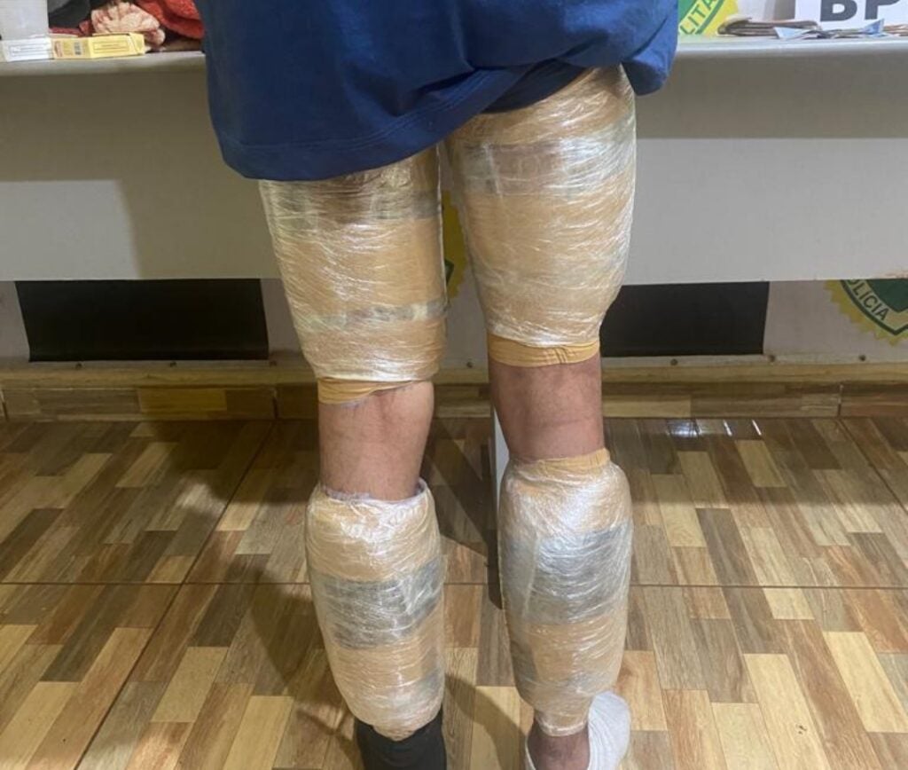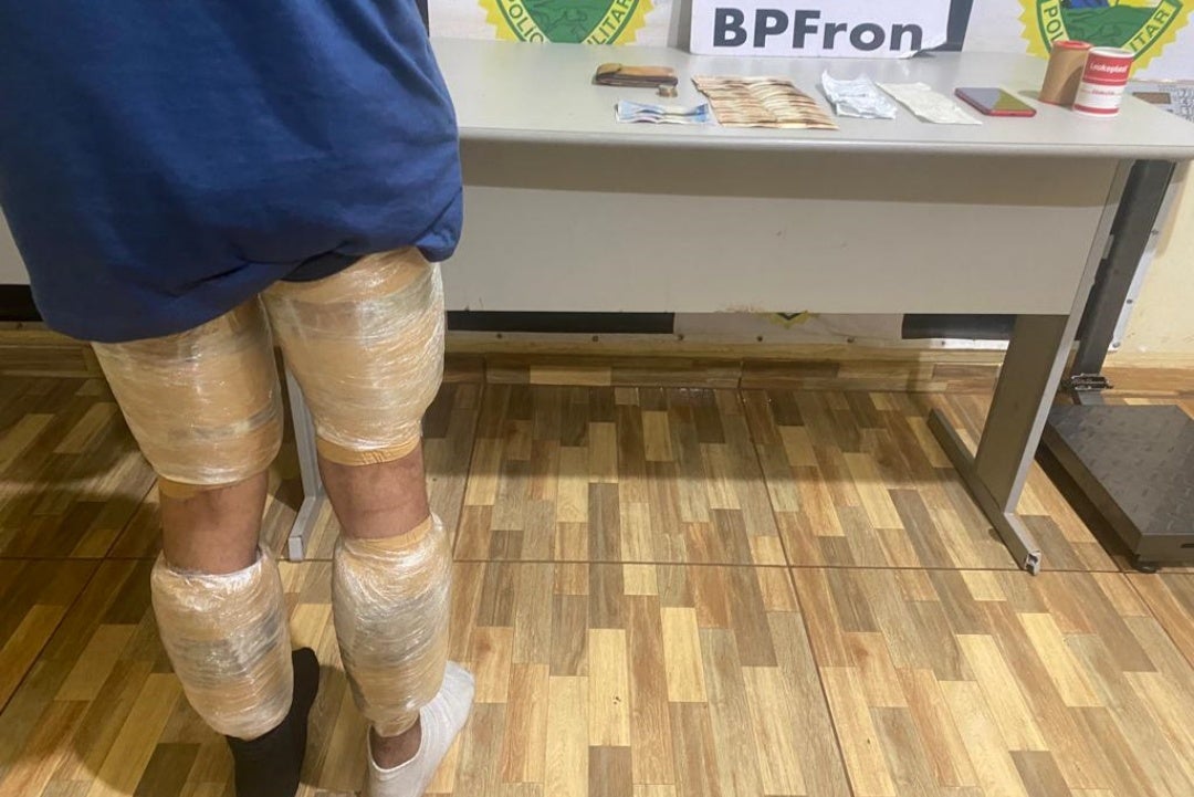 Uma equipe do Batalhão de Polícia de Fronteira (BPFron) conseguiu interceptar 6,7 quilos de haxixe que estavam sendo transportados amarrados ao corpo de um homem. As embalagens com a droga estavam concentradas nas pernas.