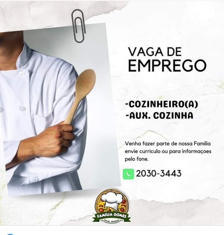 A pizzaria Família Gomes também divulgou, através de suas redes sociais, que está com vagas abertas para os cargos de auxiliar de cozinha e cozinheiro, em Umuarama.