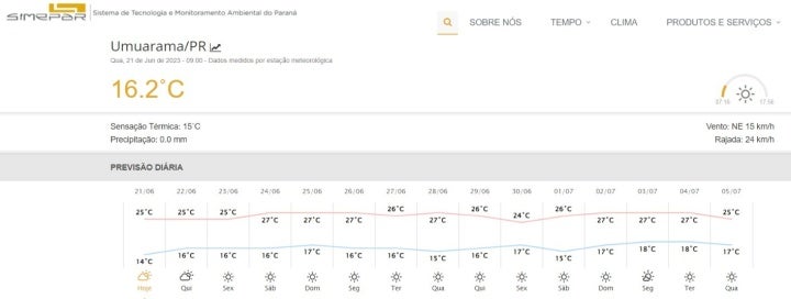 De acordo com o Simepar (Sistema de Tecnologia e Monitoramento Ambiental do Paraná), as temperaturas nos próximos dias seguirão semelhantes às desta quarta-feira (21). Na quinta-feira (22) a mínima esperada é de 16°C, e a máxima é de 25°C. O dia seguirá nublado, porém sem previsão de chuvas.