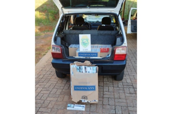 A Polícia Militar (PM) apreendeu um carro que foi usado para transportar caixas de cigarros paraguaios após uma tentativa de abordagem na PR-485, entre os municípios de Pérola e Cafezal do Sul, nesta quarta-feira (28). O condutor – que segundo a PM é reincidente na prática de contrabando – abandonou o veículo e fugiu a pé.