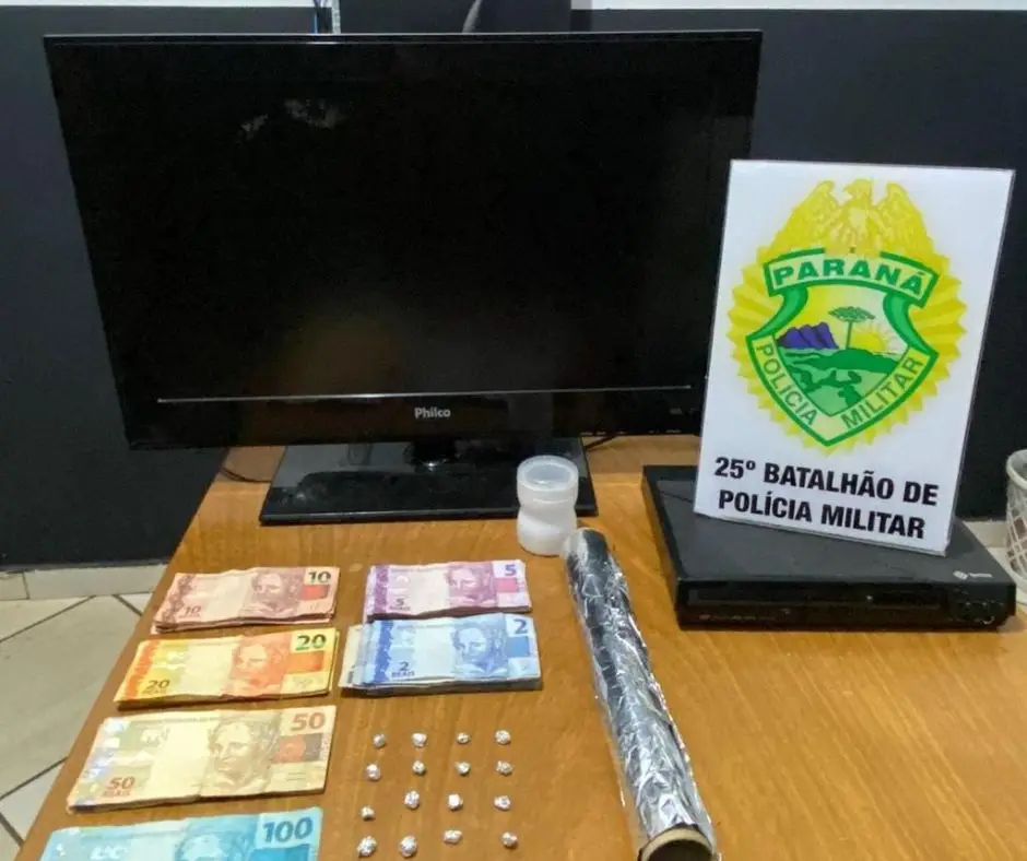 A Polícia Militar (PM) pôs fim na noite deste sábado (1) a um local usado como sucursal de venda de drogas, no bairro Primeiro de Maio, em Umuarama. Um jovem de 21 anos foi preso por tráfico e receptação. Ele estava em posse de eletrônicos, crack e dinheiro.
