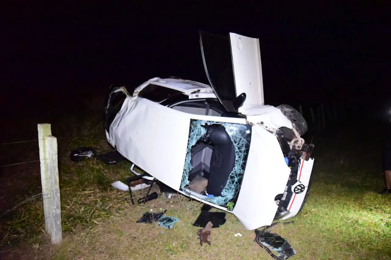 “Quando eu vi o boi, desviei para o lado, o carro derrapou e veio a cair aqui no barranco”, disse o condutor. “O susto foi grande, mas estamos todos bem”, afirmou. O veículo ficou destruído, virado em meio à pastagem com duas rodas para cima.