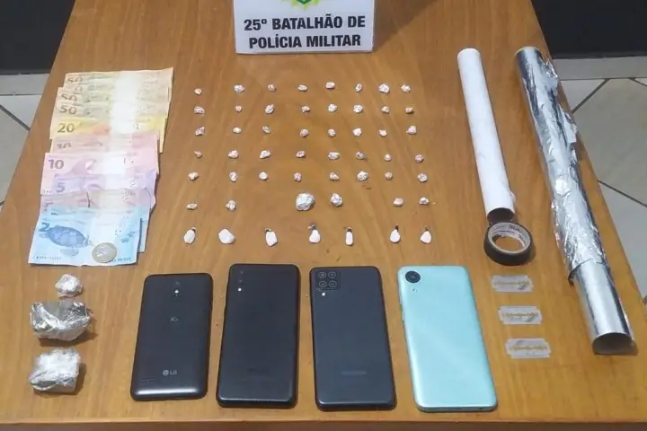 A equipe policial informou que, após denúncia de que uma residência era utilizada para tráfico de drogas, foram até o local investigar e encontraram o ponto de vendas. Dentro da residência havia 11g de pedras de crack, 2g de buchas de cocaína, 40g de substância análoga a maconha, 4 aparelhos celulares, R$265 em dinheiro, papel alumínio e fita isolante.