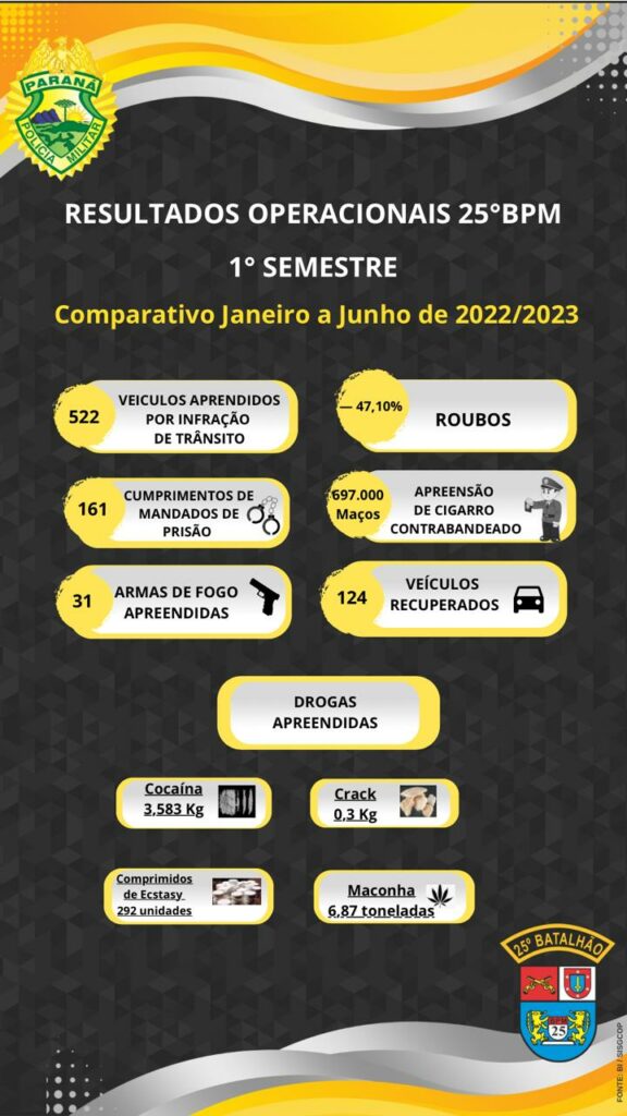 O 25º Batalhão de Polícia Militar (BPM), com sede em Umuarama, apresentou o resultados estatísticos do primeiro semestre de 2023 em toda a área de atuação da unidade. Segundo os números apresentados, foram 697 mil maços de cigarros apreendidos, 31 armas de fogo recolhidas e quase 7 toneladas de maconha encaminhadas para incineração.