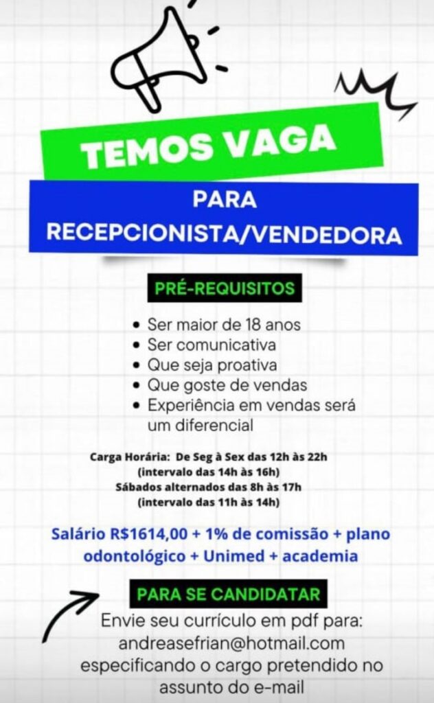 A Academia Stay Fit também divulgou atravpes de suas redes sociais que está com vagas abertas para o cargo de recepcionista/vendedora. Dentre os requisitos, é exigido que a candidata tenha mais de 18 anos e seja comunicativa, proativa e que goste de trabalhar com vendas. Experiência na área será um diferencial.