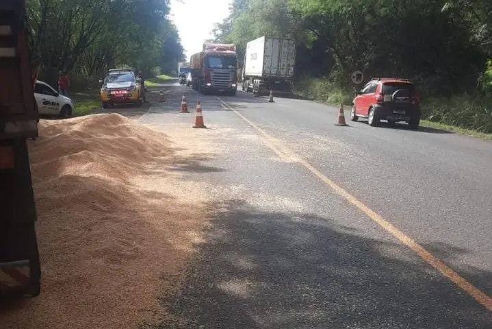 O impacto foi suficiente para tombar o bitrem e despejar a carga de soja no veículo sobre a pista de rolamento. O trânsito foi controlado pelas equipes da polícia rodoviária, que interditou o trecho no período da manhã e fez o controle no sistema “siga e pare”.