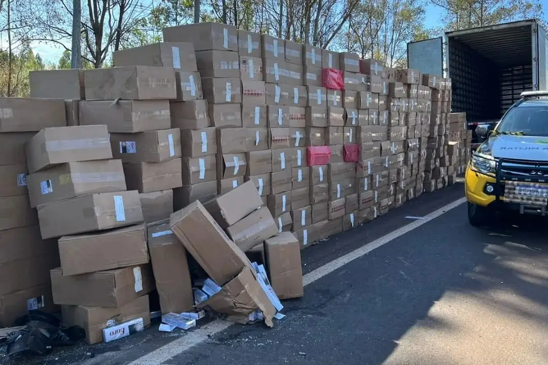 O Batalhão de Polícia Rodoviária (BPRv) apreendeu 765 caixas de cigarros contrabandeados, nesta quinta-feira (13), na PR-323, em Cianorte, no Noroeste do Paraná, durante atendimento a um acidente na rodovia.