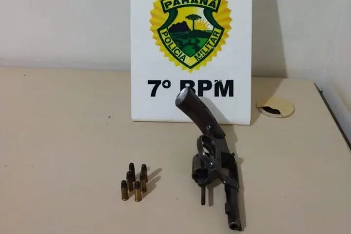A Polícia Militar (PM) apreendeu um revólver calibre .38 municiado e prendeu dois homens, na noite desta sexta-feira (14), em Goioerê, após uma confusão que teve início em um bar do município. De acordo com testemunhas, os suspeitos estariam mostrando a arma para várias pessoas no estabelecimento.