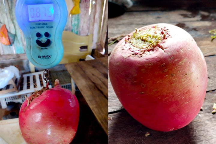 Anailde vive em uma chácara localizada na estrada 215, entre Serra dos Dourados e Ivaté. Normalmente, segundo ela, um rabanete comum pesa entre 300 a 400 gramas, no máximo, então é de se entender a surpresa que a trabalhadora teve no momento de remover a hortaliça da terra.