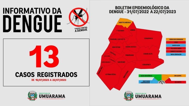 A única exceção é a região do bairro Parque das Jabuticabeiras, que exibe a cor amarelo (que quer dizer ‘em estado de alerta’). Para se ter uma ideia da situação, no último trimestre 416 pessoas foram diagnosticadas com a doença em Umuarama.