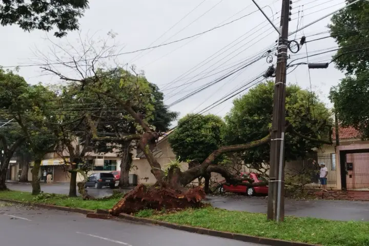 Uma árvore de médio porte caiu sobre um veículo Chevrolet/Celta que estava estacionado na Avenida Pernambuco, entre a Avenida São Paulo e a Rua Ninas, na tarde desta sexta-feira (28), em Umuarama. Possivelmente a queda tenha sido provocada pelo solo encharcado pelas chuvas que caem desde o início do dia.