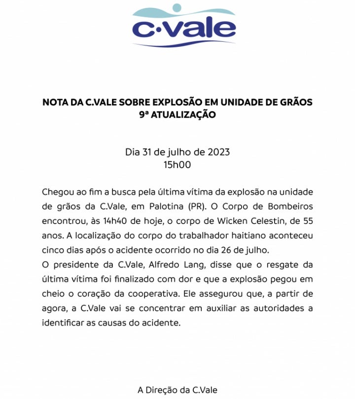 A C. Vale divulgou uma nota às 15h, logo após a localização do trabalhador. “Chegou ao fim a busca pela última vítima da explosão na unidade de grãos da C.Vale, em Palotina (PR). O Corpo de Bombeiros encontrou, às 14h40 de hoje, o corpo de Wicken Celestin, de 55 anos. A localização do corpo do trabalhador haitiano aconteceu cinco dias após o acidente ocorrido no dia 26 de julho”.