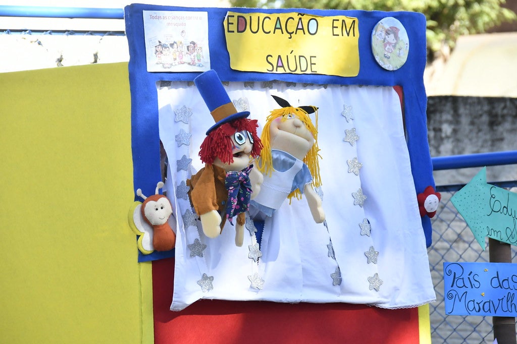 As crianças também participaram de uma apresentação teatral do grupo de educação em saúde da Vigilância Ambiental, que fez uma paródia da saga de Alice no País das Maravilhas para orientar os alunos sobre cuidados que devem ser tomados para combater a proliferação do mosquito.