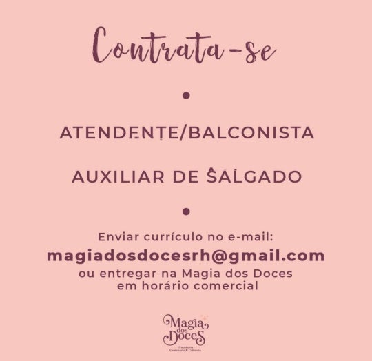 A Magia dos Doces também abriu duas vagas para os cargos de atendente/balconista e auxiliar de salgado. Interessados devem enviar currículo no e-mail magiadosdocesrh@gmail.com ou entregá-lo diretamente na loja em horário comercial.