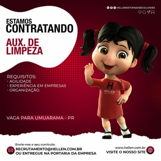 A Estofados Hellen divulgou através de suas redes sociais que está com uma vaga aberta para o cargo de auxiliar de limpeza. Dentre os requisitos, é exigido agilidade do colaborador, experiência e organização.