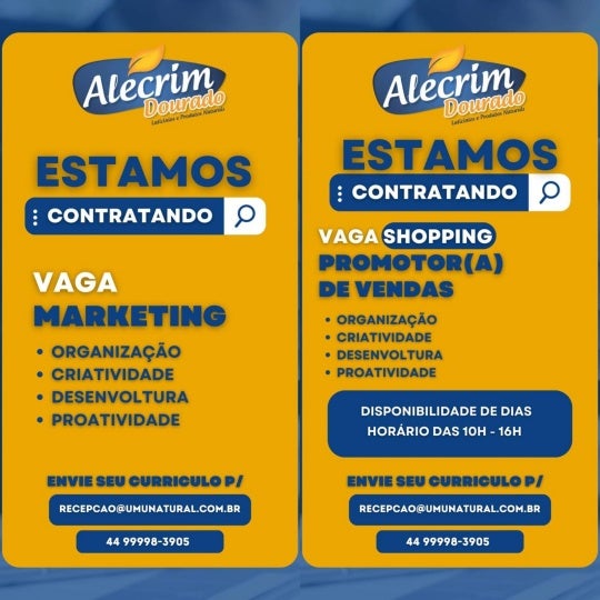 A Alecrim Dourado divulgou que está procurando colaboradores para as lojas da franquia em Umuarama. Há vagas para dos cargos de promotor de vendas, para marketing e para vendedores.