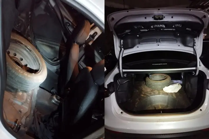 Em vistoria no Cronos, os policiais constataram que haviam sido retirados os bancos traseiros, do carona, forros de portas e porta-malas. Além disso, no assoalho do carona havia duas placas no padrão Mercosul com outra numeração, que possivelmente seria instalada no veículo para utilização de transporte de contrabando.