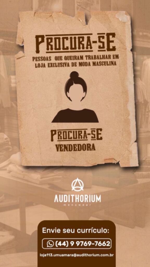 A loja Audithorium do Shopping Palladium de Umuarama também divulgou que está com uma vaga aberta para vendedoras que queiram trabalhar com moda masculina.