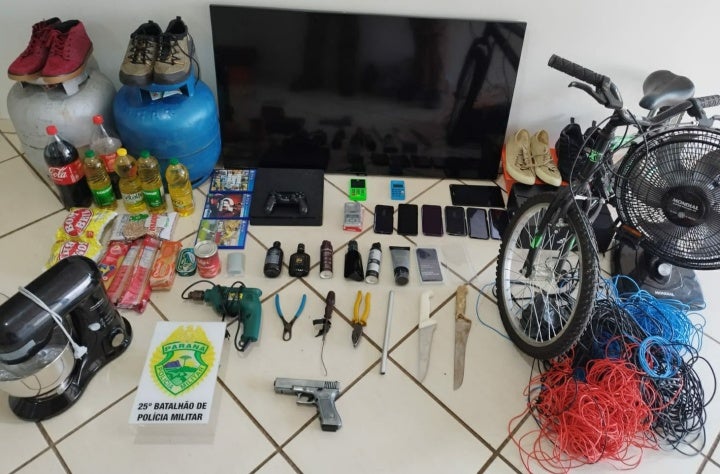 A casa foi vistoriada e os PMs encontraram uma TV, um vídeo game, um botijão de gás, fios elétricos, um simulacro de arma de fogo e uma balança de precisão.
