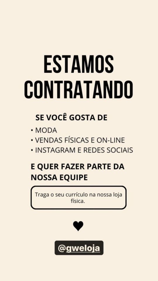 A loja GWE também divulgou, através das redes sociais, que está aceitando currículos para a contratação de um novo colaborador que tenha interesse em moda, vendas físicas e on-line, além de Instagram e redes sociais.