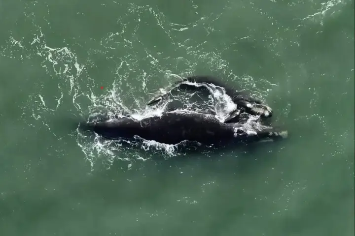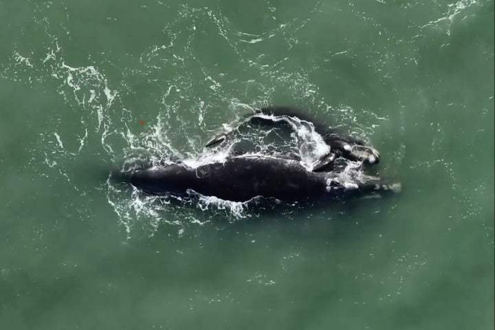 A baleia-franca adulta tinha um tamanho estimado de 15 metros, enquanto o filhote media aproximadamente 6 metros.