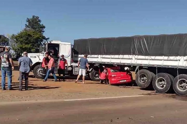 De acordo com informações do Corpo de Bombeiros, o carro ficou prensado no semirreboque da carreta e duas vítimas ficaram presas nas ferragens.