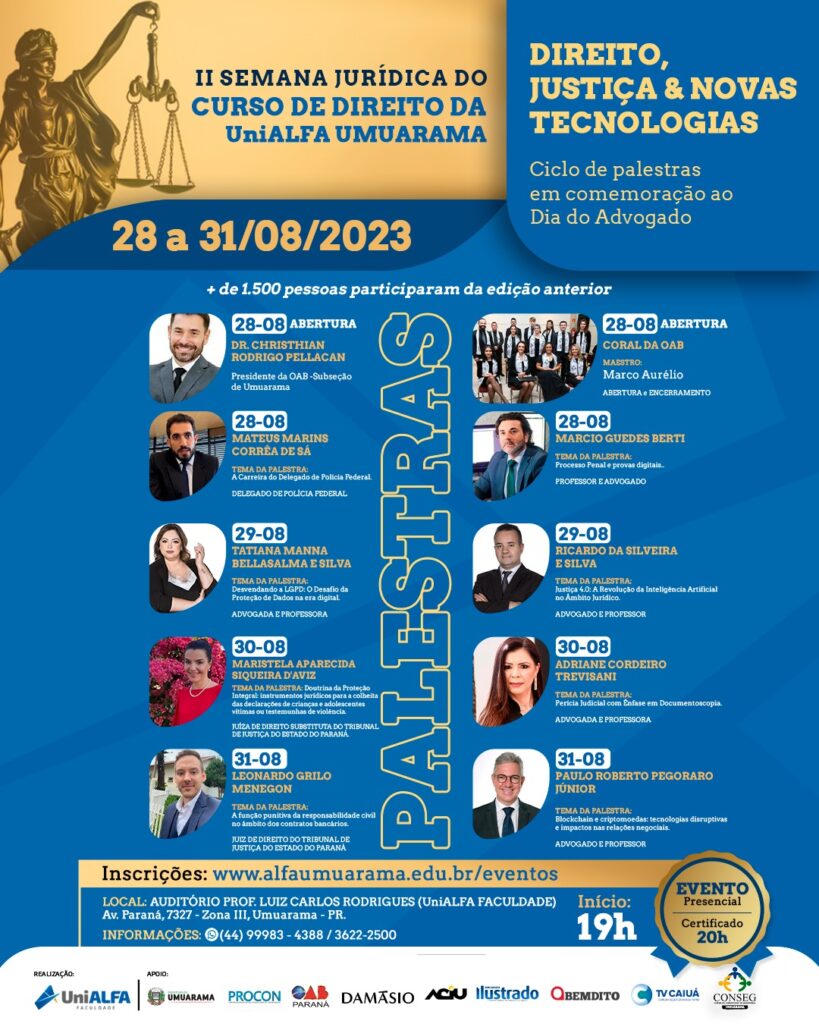 A UniAlfa Faculdade de Umuarama inicia na próxima segunda-feira (28) a segunda edição da Semana Jurídica do Curso de Direito. O evento contará com os renomados palestrantes na área do conhecimento e da prática.