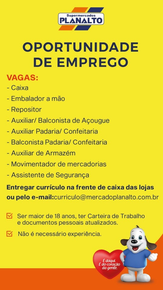 A rede de Supermercados Planalto também divulgou que está com diversas oportunidades de emprego para os cargos de caixa; embalador; repositor; auxiliar/balconista de açougue; auxiliar de padaria e confeitaria; auxiliar de armazém; movimentador de mercadorias; e assistente de segurança. Não é necessário experiência para ingresso nas vagas.