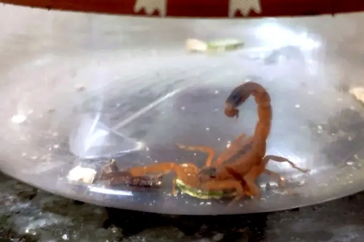 Aproveitando que o escorpião se alimentava de um pequeno besouro, a amiga de Rafaela conseguiu capturar o animal dentro de um pote de plástico. Ambas ficaram apavoradas principalmente pelo comportamento do bicho – que mede aproximadamente 5 centímetros -, que estava pronto para atacá-las no primeiro deslize.