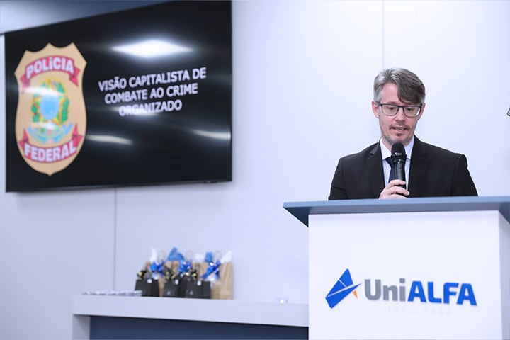 O primeiro palestrante da noite foi Alexander Boeing Noronha Dias, Delegado da Polícia Federal em Maringá. Ele abordou o funcionamento da Polícia Federal no combate aos crimes financeiros. Alexander disse que os primeiros trabalhos foram mais complicados, depois os policiais começaram a realizar operações de maior porte e com alvos mais robustos.
