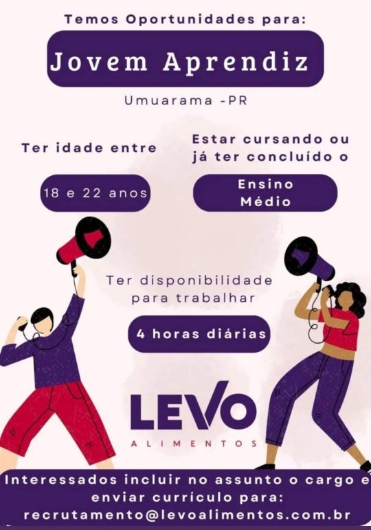 A Levo Alimentos também divulgou que está com oportunidades para Jovem Aprendiz em Umuarama. Os requisitos são ter idade entre 18 e 22 anos e estar cursando ou já ter concluído o Ensino Médio.