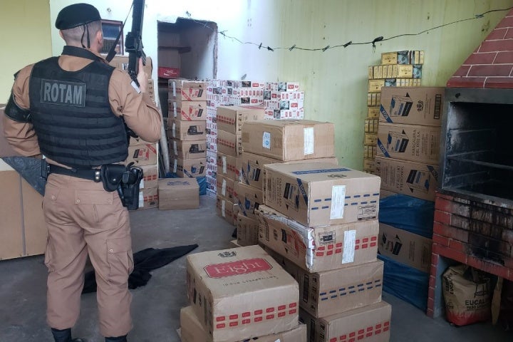 Policiais da Rotam (Rondas Ostensivas Táticas Metropolitanas) apreenderam 35 caixas de cigarros contrabandeadas do Paraguai nesta sexta-feira (1º), em uma propriedade no bairro San Remo I, em Umuarama.
