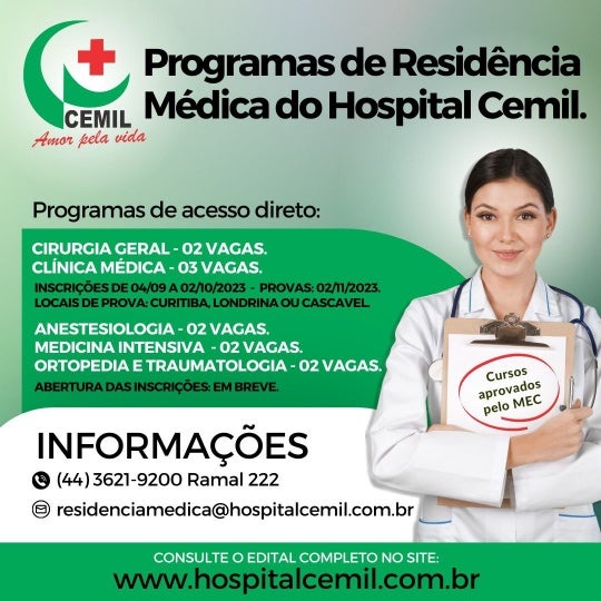 O link para o edital das inscrições e com maiores detalhes sobre os cursos e provas já está disponível no site do Hospital Cemil: https://hospitalcemil.com.br/ensino-e-pesquisa/