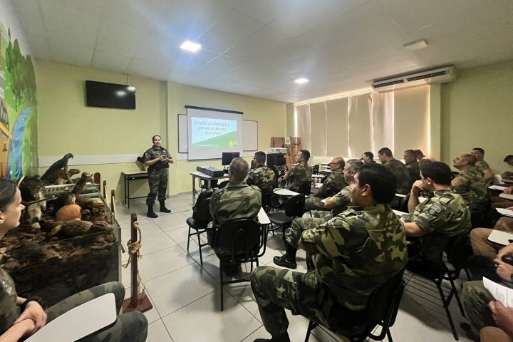 Nesta segunda-feira (4), os policiais ambientais da 3ª Cia da Polícia Ambiental Força Verde (PMAmb/FV) participaram de instrução ministrada pela Soldado Kesley, sobre a contenção e manejo de animais silvestres.