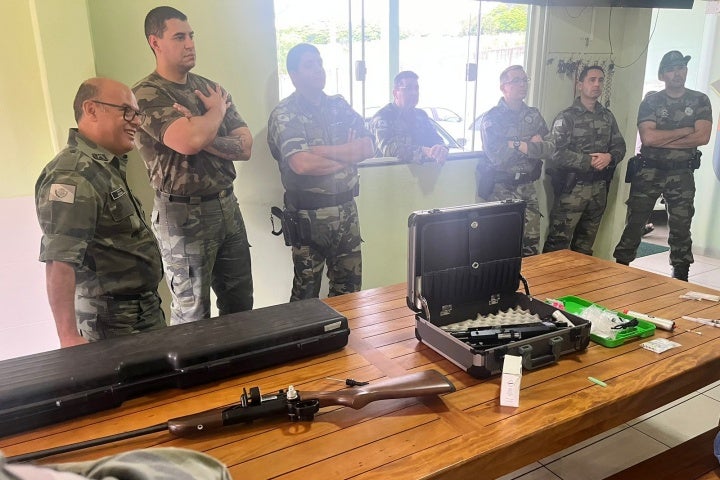 Ao todo foram instruídos 15 policiais, os quais, além de adquirirem conhecimentos sobre as técnicas de contenção de diversas espécies, aprenderam a manusear o armamento utilizado para contenção química, projetor de dardos.