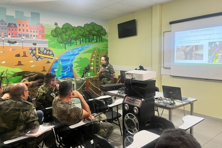 Após participar do Estágio de Especialização Profissional de Identificação e Manejo de Animais Silvestres, a instrutora compartilhou os conhecimentos adquiridos para que os policiais da Companhia possam atuar com as técnicas necessárias nestas ocorrências.
