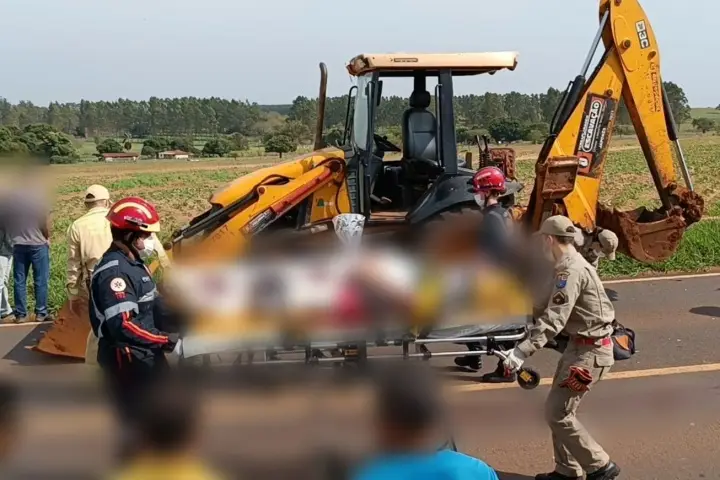 O acidente aconteceu por volta das 10h15. De acordo com as informações, a retroescavadeira bateu seguia pela rodovia no sentido à Cianorte quando a vítima colidiu na traseira em uma motoneta Honda Biz. Com o impacto, o idoso sofreu uma fratura exposta de fêmur, trauma em quadril e perdeu muito sangue.