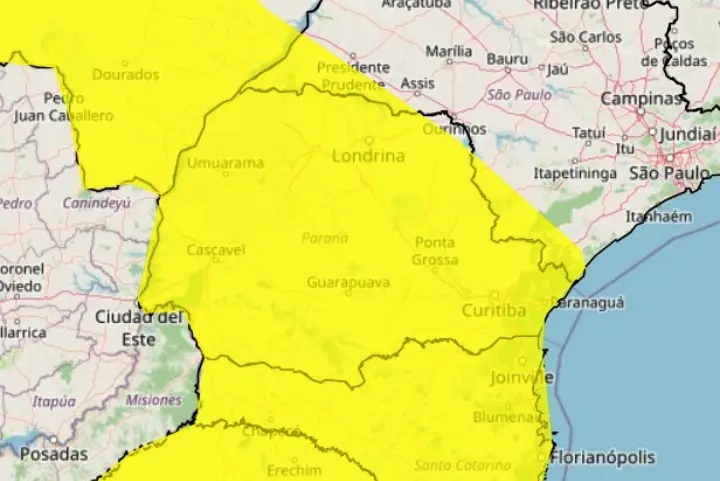 Segundo o Inmet, a previsão é que diversos municípios não só do Paraná, mas também do Rio Grande do Sul, de Santa Catarina, do Mato Grosso e do Mato Grosso do Sul registrem ao longo do dia chuva entre 20 e 300 milímetros por hora ou até 50 mm/dia; ventos intensos (com velocidade entre 40 e 60 km/h) e queda de granizo.