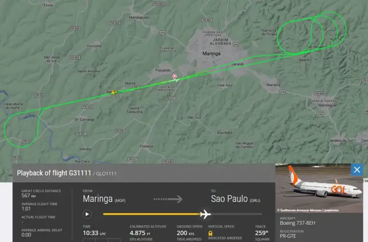 O avião da Gol decolou às 07h08 da cabeceira 10 do aeroporto de Maringá com destino ao Aeroporto Internacional de São Paulo, em Guarulhos, mas cinco minutos depois o Boeing 737 foi colocado em trajetórias circulares de espera em voo. Dez minutos depois foi autorizado a pousar. Às 07h47 estava em solo novamente.