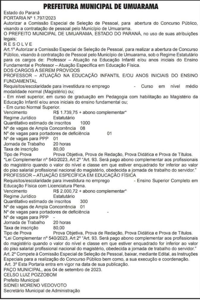 No último dia 4 de setembro, a Prefeitura de Umuarama publicou uma portaria no Diário Oficial do município, autorizando a abertura de concurso público. O certame visa à contratação de pessoal sob o Regime Estatutário para os cargos de professor.