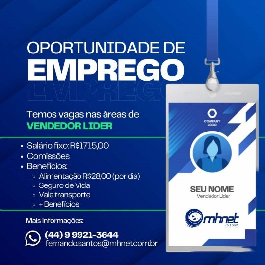 A empresa Mhnet Telecom também divulgou que está com uma vaga disponível para vendedor líder em Umuarama. Dentre os requisitos é exigido que o profissional tenha CNH (Carteira Nacional de Habilitação) em dia, categoria B.