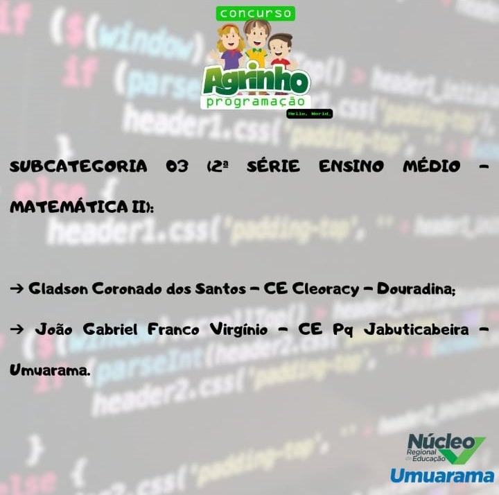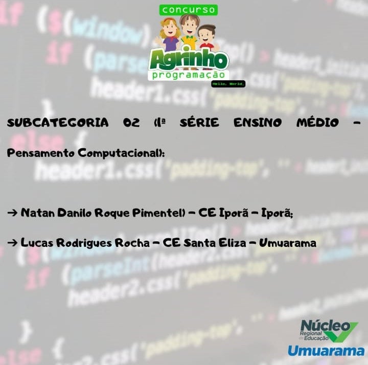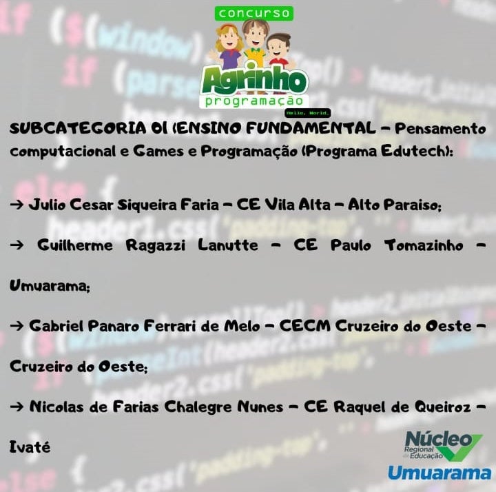 O Núcleo Regional de Educação de Umuarama divulgou nesta segunda-feira (11) a lista dos 8 classificados para a fase estadual do Concurso Agrinho, na categoria programação. O concurso é realizado em parceria entre o Sistema Federação da Agricultura do Paraná (Faep) e o Serviço Nacional de Aprendizagem Rural (Senar-PR), com o Estado.