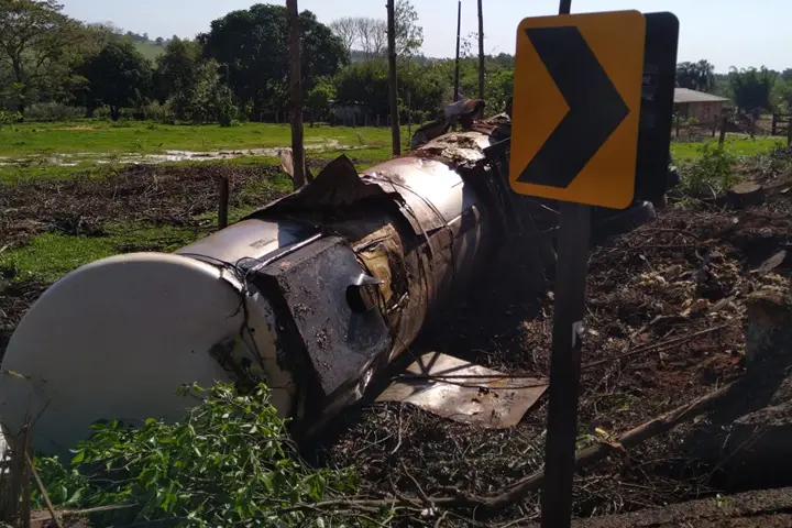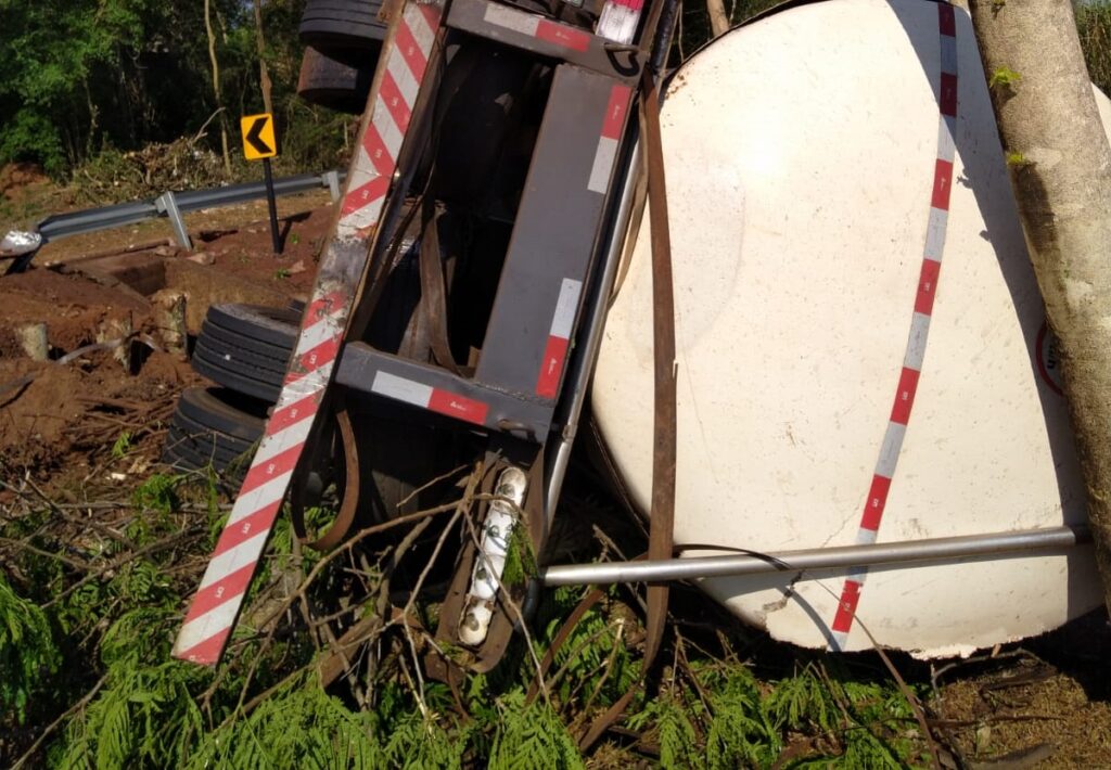 Uma carreta tanque carregada com leite tombou na tarde desde sábado (16), na PR 490, no trecho conhecido como “Curva da Morte”, entre Altônia e São Jorge do Patrocínio.