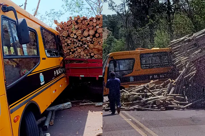 Um acidente de trânsito envolvendo um caminhão carregado de lenha e um ônibus escolar em Alto Piquiri nesta terça-feira (19), no trecho que liga Alto Piquiri à PR-486, causou um grande susto tanto ao motorista do caminhão quanto ao condutor do ônibus.