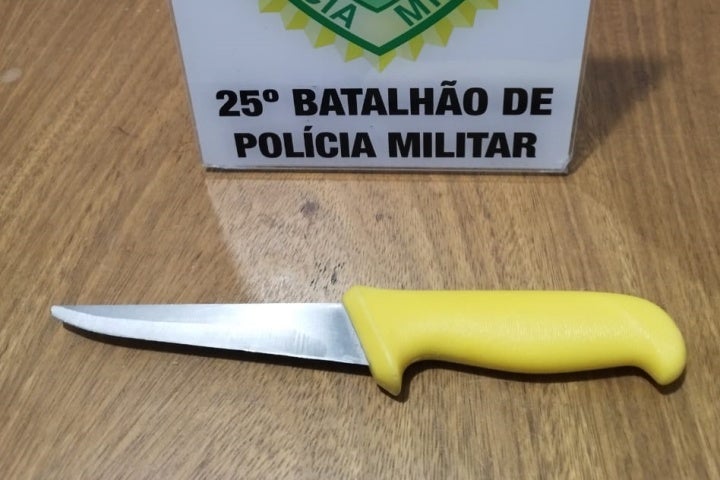 Durante o atendimento à ocorrência, o homem foi flagrado saindo da residência da família em seu veículo, porém foi abordado. Durante a conversa ele afirmou que a faca utilizada na ameaça estava na cozinha de casa.