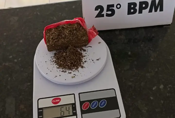 Dentro do veículo os policiais localizaram um pote de vidro com maconha. A droga foi pesada posteriormente e totalizou 64 gramas.