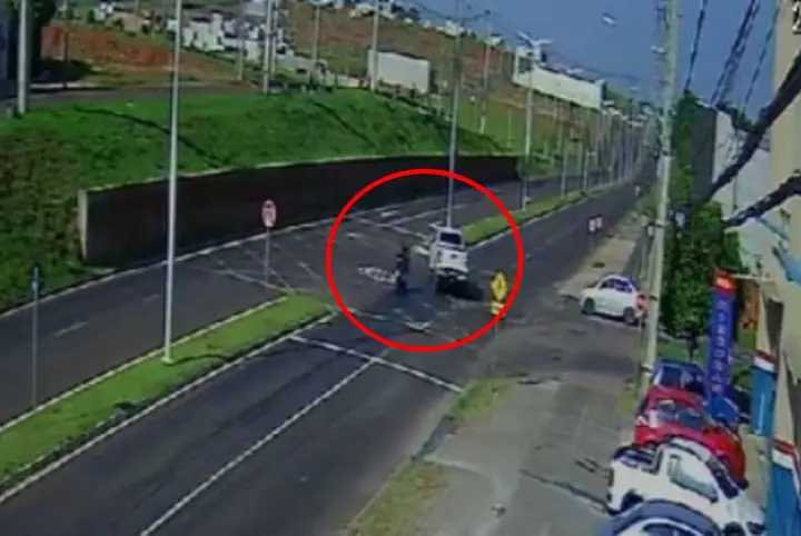 Durante um patrulhamento de rotina, a equipe RPA da Polícia Militar (PM) deparou-se com um acidente de trânsito envolvendo uma camionete Hilux de cor branca e uma motocicleta Kawasaki Ninja 400. A câmera de monitoramento de uma empresa próxima registrou a colisão.